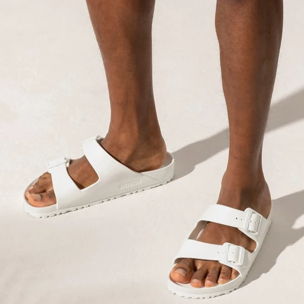 The legendary two-strap design from BIRKENSTOCK – the Arizona. Modeled on the cork original, this sandal is made from ultra lightweight and highly flexible EVA. These sandals are shock absorbing, waterproof, and skin-friendly. Wear them at the beach, in the garden, or around the gym and after workouts. It’s the perfect addition to your classic BIRKENSTOCK sandals.