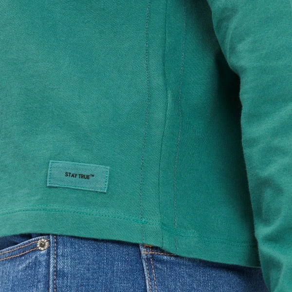 - Relaxed boxy fit with a slight dropped shoulder, cotton/spandex rib at crew neck and cuffs, self-fabric taping inside back neck.
