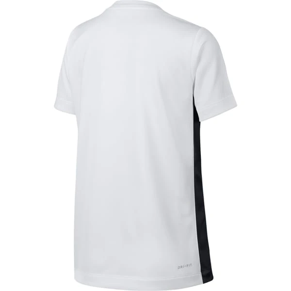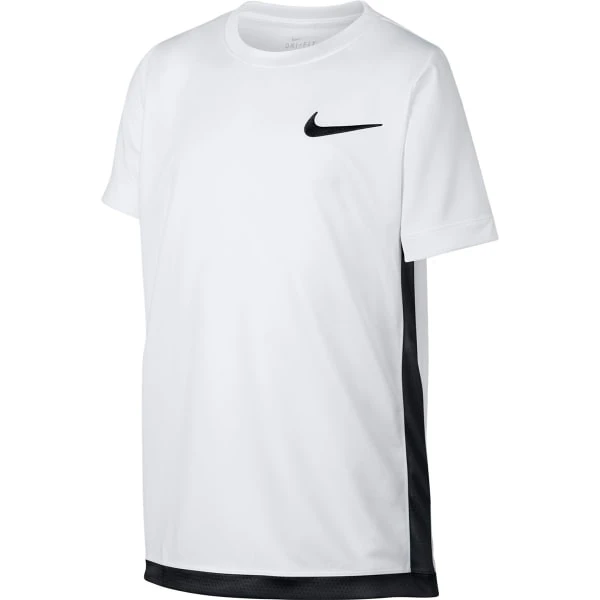 This boys’ t-shirt designed with Nike Dri-FIT technology, which wicks sweat to keep him cool and dry. It features contrast trims at the sides and hem and an embroidered Nike Swoosh on the left chest.