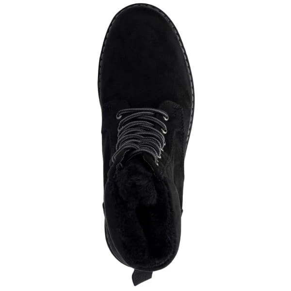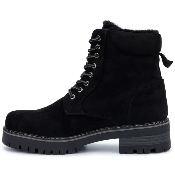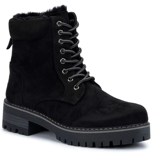 Comfort and glamourous style meet in the cool look of these velvety combat-style boots. Inside the collar is a soft faux-fur trim for added comfort.
