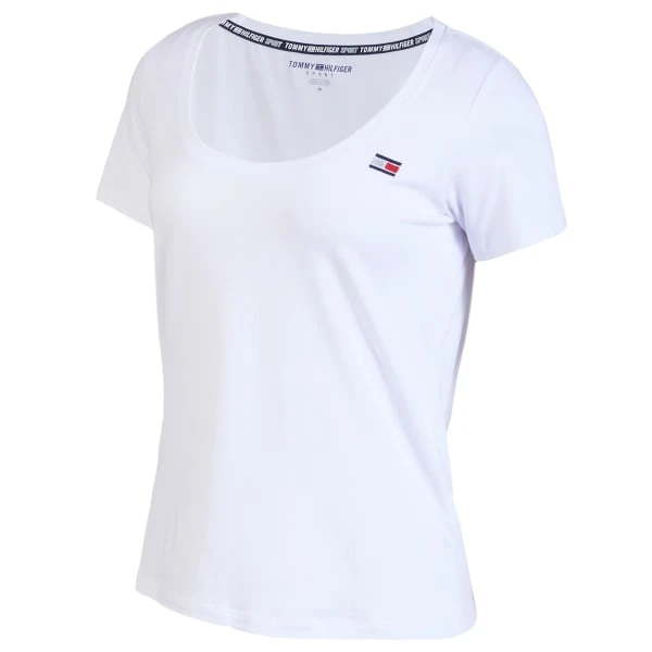 A small Tommy Hilfiger logo adorns the front of this cotton top, styled with a sweeping scoop neckline. Wear it to the gym, on the trail, or whever you get exercise.