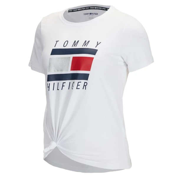 Head to the gym, for a run, or just enjoy some time outside in this TOMMY HILFIGER Women’s Logo Knot Front Tee.