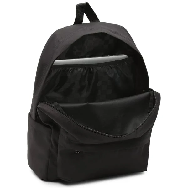 The Old Skool H2O Solid Backpack is a 100% polyester backpack featuring one large main compartment with a laptop sleeve (fits most 15” laptops), a front zip pocket with an organizer for quick access, and straight-cut padded shoulder straps.